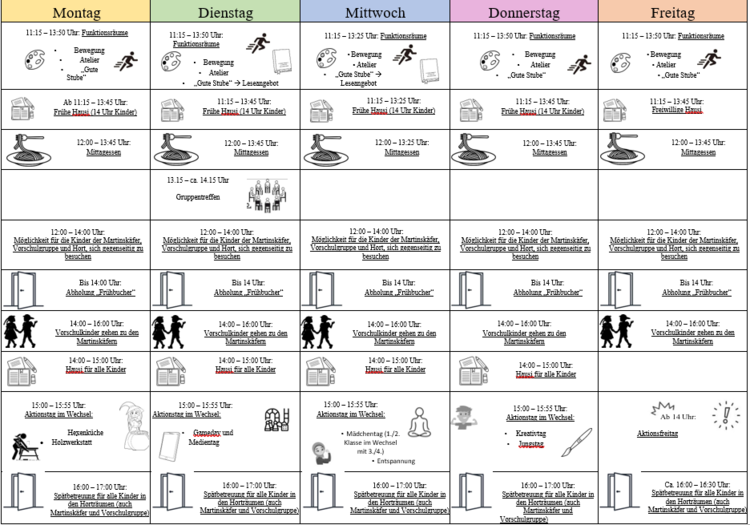 Gerne können Sie mit ihrem Kind ins Gespräch kommen, an welchen Aktionen es teilnehmen möchte. Die Pädagoginnen und Pädagogen bitten darum, an diesen Tagen die Kinder erst um 16.00 Uhr abzuholen, um Störungen und Unterbrechungen zu vermeiden.