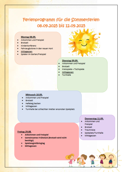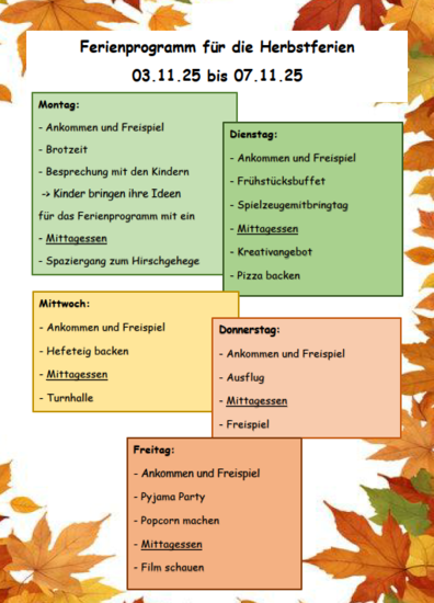 In den Ferien bieten wir eine Ferienbetreuung für die Kinder des Hortes an. Diese muss man bei Eintritt oder bei Bedarf buchen. Betreut wird von Montag - Donnerstag von 7-16.30 Uhr und am Freitag bis 16.00 Uhr.
